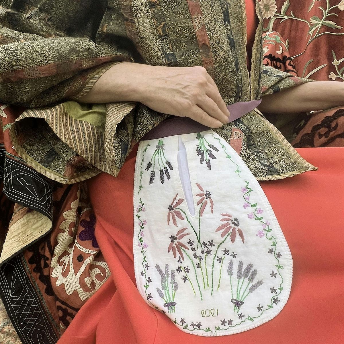 You will be able to have a go at making your own decorated historical tie-on pocket, as worn by women in the 18th Century when pockets were not sewn into garments, but were seperate articles of clothing tied around the waist between skirts and petticat - often a woman's only private place.