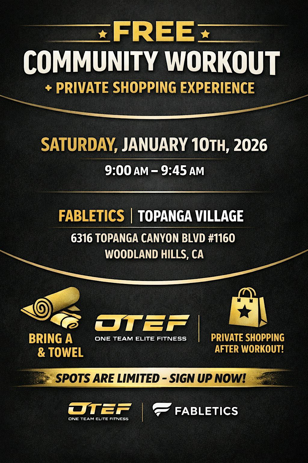 Join us for a FREE community workout hosted by Diego & Cesar of One Team Elite Fitness, followed by an exclusive private shopping experience with Fabletics.