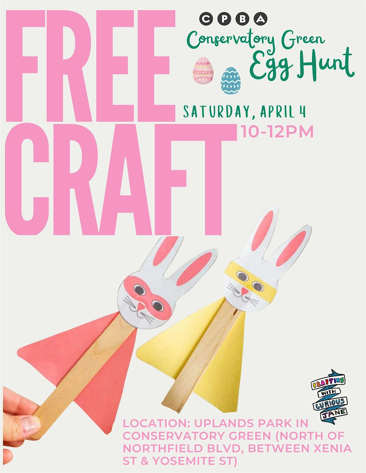 Curious Jane will be offering a free hands-on craft at the CPBA Conservatory Green Annual Easter Egg Hunt in Northfield Central Park.