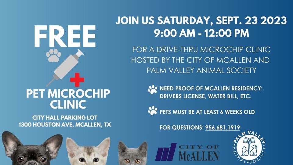 Calling all McAllen residents! The City of McAllen is inviting all pet owners in McAllen to a FREE drive-thru microchip clinic on Saturday, September 23rd from 9:00am - 12:00pm.