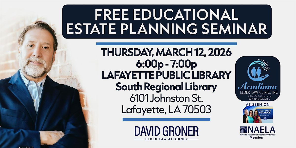 Join us at the LAFAYETTE PUBLIC LIBRARY - South Regional Branch on Thursday, March 12, 2026, at 6:00 PM, for an informative session on estate planning. Our expert will guide you through the essentials of estate planning in a simple and easy-to-understand manner. Don't miss this opportunity to learn and have your questions answered. Mark your calendars and we'll see you there!