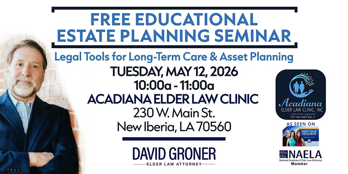 Join us at the Acadiana Elder Law Clinic on MAY 12, 2026, at 10:00 AM for a casual and informative seminar on estate planning. Whether you're just starting out or want to update your plans, this event is perfect for you. Come to learn, ask questions, and get peace of mind about your future. Don’t miss out on this great opportunity to get expert advice in person!