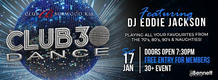 DJ Eddie JacksonWe’re launching 2026 the only way we know how—on a packed dancefloor.Club 30 Dance returns for its first event of the year, delivering a refined retro experience designed specifically for the over-30s crowd. Expect a high-energy night of iconic hits from the 70s, 80s, 90s and early 2000s, curated to keep the room moving from doors open to close.Behind the decks will be DJ Eddie Jackson, bringing proven crowd awareness, seamless mixing and the kind of track selection that turns “I’ll just pop in” into a full night out.This is not a throwback night stuck in the past—it’s a polished, social, feel-good experience for people who still love to dance, just without the chaos.What to expectTimeless retro anthems from the 70s through to the 2000sA welcoming, grown-up crowd and buzzing atmosphereA consistent, high-quality music experienceFREE entry for Club Burwood Group membersNot a member? Sign up on the night for just $2 (valid through 31 December 2026).Event details