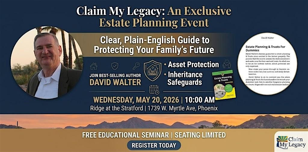 Join David Walter, Co-Founder of Claim My Legacy and author of Estate Planning & Trusts for Dummies: A Plain English Guide to Wills and Trusts, for an informative educational event. At Claim My Legacy, we do more than just documents...we protect the ones you love most.