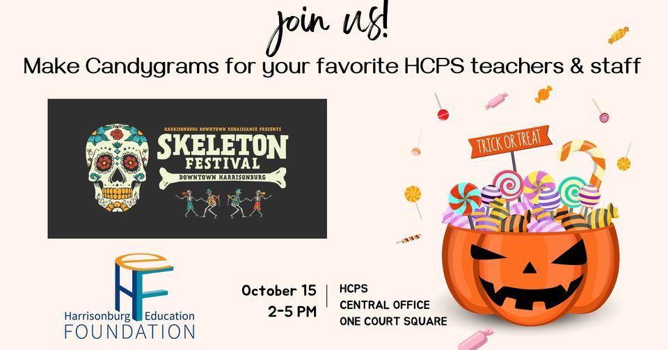 Harrisonburg Education Foundation is delighted to join the Skeleton Festival presented by Harrisonburg Downtown Renaissance. In addition to being a trick or treat stop, you will have a chance to make candygrams for your favorite teachers and staff of Harrisonburg City Public Schools. We will deliver these treats for you and provide all the materials (while supplies last)! Just another way to say thank you to all of our educators. Kids and adults welcome. Look for us in front of the Central Office at 1 Court Square.