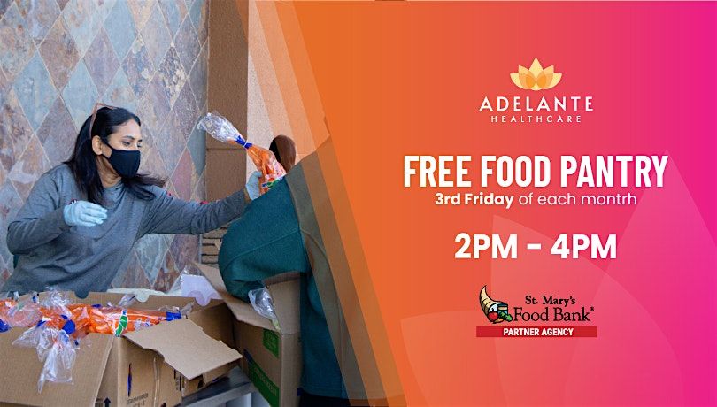 Adelante Healthcare and St. Mary’s Food Bank are teaming up to bring a Free Food Pantry to the community every 3rd Friday from 2 PM to 4 PM.