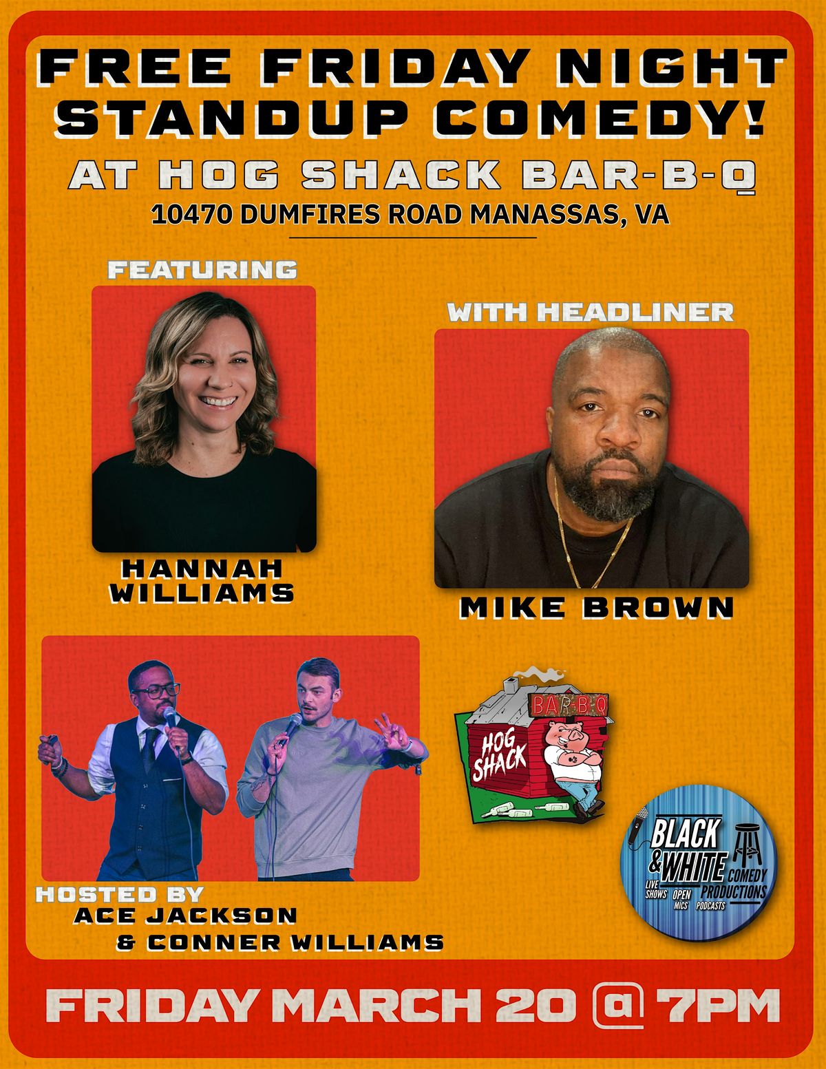 Join us for another evening of nonstop laughter at Hog Shack Bar-B-Q on Friday March 20th! Black & White Comedy Productions is putting on their monthly FREE standup comedy show right here in Manassas that you will not want to miss out on! 🎤💥