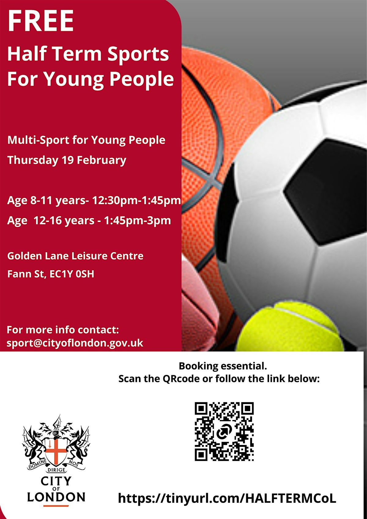 Welcome to our exciting event: Free Half Term Mulit-Sports for Children Aged 8-16 Years! Join us at 12:30-1:45 for 8-11 years and 1:45-3pm for 12-16 years, at the Golden Lane Leisure Centre for a day filled with fun and games. Let your kids unleash their energy and make new friends while participating in a variety of sports activities. Don't miss out on this fantastic opportunity for your children to stay active and have a blast during the Half Term break. See you there!