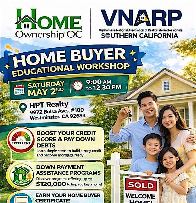 Join HomeOwnership OC, a nonprofit HUD agency, and our partner VNARP So Cal for our Free Home Buyer Certification Workshop and learn everything you need to know to buy a home, from credit to closing documents. Learn about Down Payment Assistance programs including the CalHFA, City of Garden Grove, and city of Santa Ana down payment programs offering up to $120K in down payment help. We'll also cover various first time buyer loans offering low or no down payment, credit improvement tips, the real estate process, escrow and fair housing. We will have Vietnamese translation and all attendees will receive a certificate that is required for Down Payment and First Time Buyer loan programs.Join us for lunch and some great homebuying and credit information to get you on your journey to homeownership today!