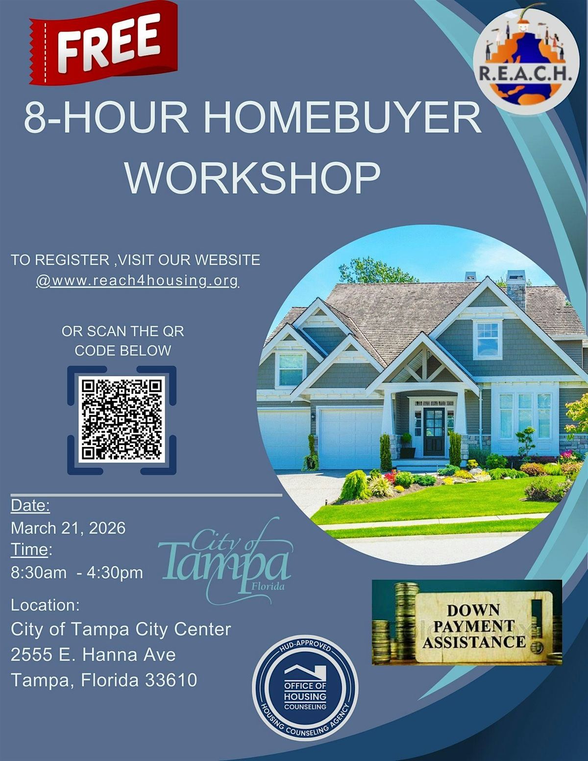 READY TO BUY YOUR FIRST HOME? YOUR JOURNEY STARTS HERE! Join us for a FREE 8-Hour In-Person Homebuyer Workshop and learn everything you need to know to confidently purchase your home in 2026.This class is designed to help you prepare, qualify, and take advantage of down payment assistance programs available to first-time homebuyers.What you will learn:How to prepare your credit and financesMortgage loan options and approval processHow to access Down Payment Assistance programsUnderstanding inspections, insurance, and closing Steps to successfully become a homeownerDate: March 21, 2026Time: 8:30 AM – 4:30 PM Location:City of Tampa – City Center2555 E. Hanna AveTampa, FL 33610This class is FREE but seats are limited!Register today:www.reach4housing.orgOr scan the QR code on the flyer.Take the first step toward homeownership and building generational wealth. Your future home starts with education!