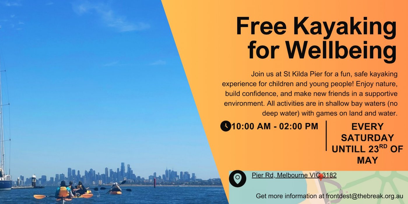 Our Free Kayaking Wellbeing Program is designed to support young people aged 12–25 years old in a safe, fun, and inclusive outdoor environment. Held near St Kilda Pier, the program encourages youths to build confidence, develop social skills, and enjoy nature through guided kayaking and interactive activities. All sessions are carefully supervised by 3 experienced kayak guides. Alongside kayaking, participants can participate in engaging games both on the land and in the water, helping them feel comfortable, connected, and supported. The program promotes teamwork, resilience, and emotional wellbeing while creating positive and memorable experiences. Parents are also welcome to join, creating a supportive community atmosphere where youth feel encouraged and inspired. This initiative aims to help youth engage in prosocial activities, relax, have fun, and grow in a safe and nurturing space.