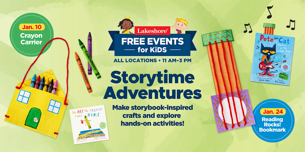 Storybook fans, get ready to unlock your imagination one page at time! At each event we’re making a different take-home craft based on a beloved children’s tale. Plus, kids can design and decorate characters for their own stories—and try out top-rated products in the Play & Discover area! Parents and guardians, be sure to check in when you arrive for a chance to win a $100 Lakeshore e-gift card!