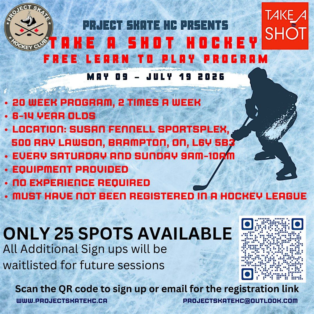 Project Skate Hockey Club is excited to continue Take A Shot Hockey, a free learn-to-play program designed for children aged 6–14 years old.