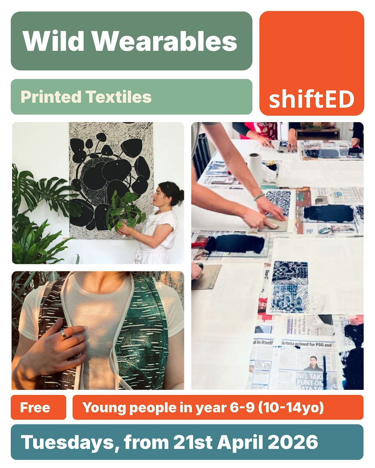Dive into a textile workshop adventure where you’ll dye, print, quilt, and sew your own creations inspired by plants, ecology, and biodiversity. Design and carve your own lino prints to make unique fabrics, then turn them into a quilted Japanese-style gile (waistcoat) you can actually wear. This is a hands-on, creative experience perfect for young people interested in art, fashion and textiles.