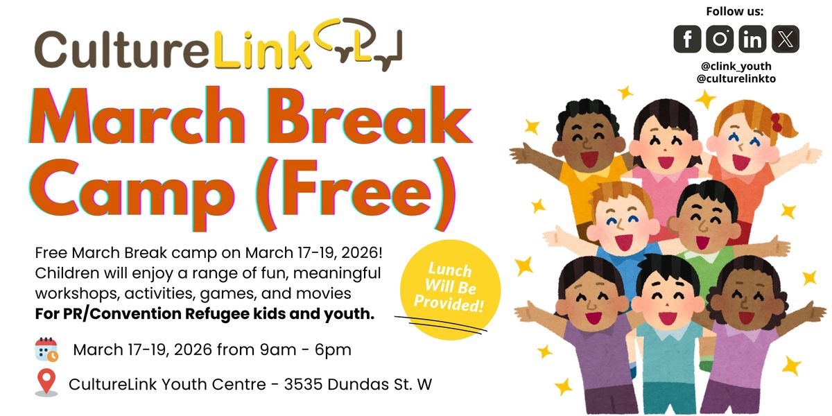 Join us for a fun-filled March Break Camp for newcomer children and youth! From March 17–19, 2026, participants will enjoy engaging activities at CultureLink Children & Youth Centre in Toronto, including art workshops, games (including Nintendo Switch Games), leadership and teamwork sessions, a movie afternoon, and a tour of the Shevchenko Museum.