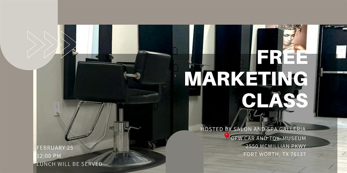 Join us Feb 25 at 12:00 PM for a FREE Marketing Class BY Salon & Spa Galleria @ DFW CAR AND TOY MUSEUM– 2550 McMillan Pkwy, Fort Worth, TX 76137! 🍴🥂