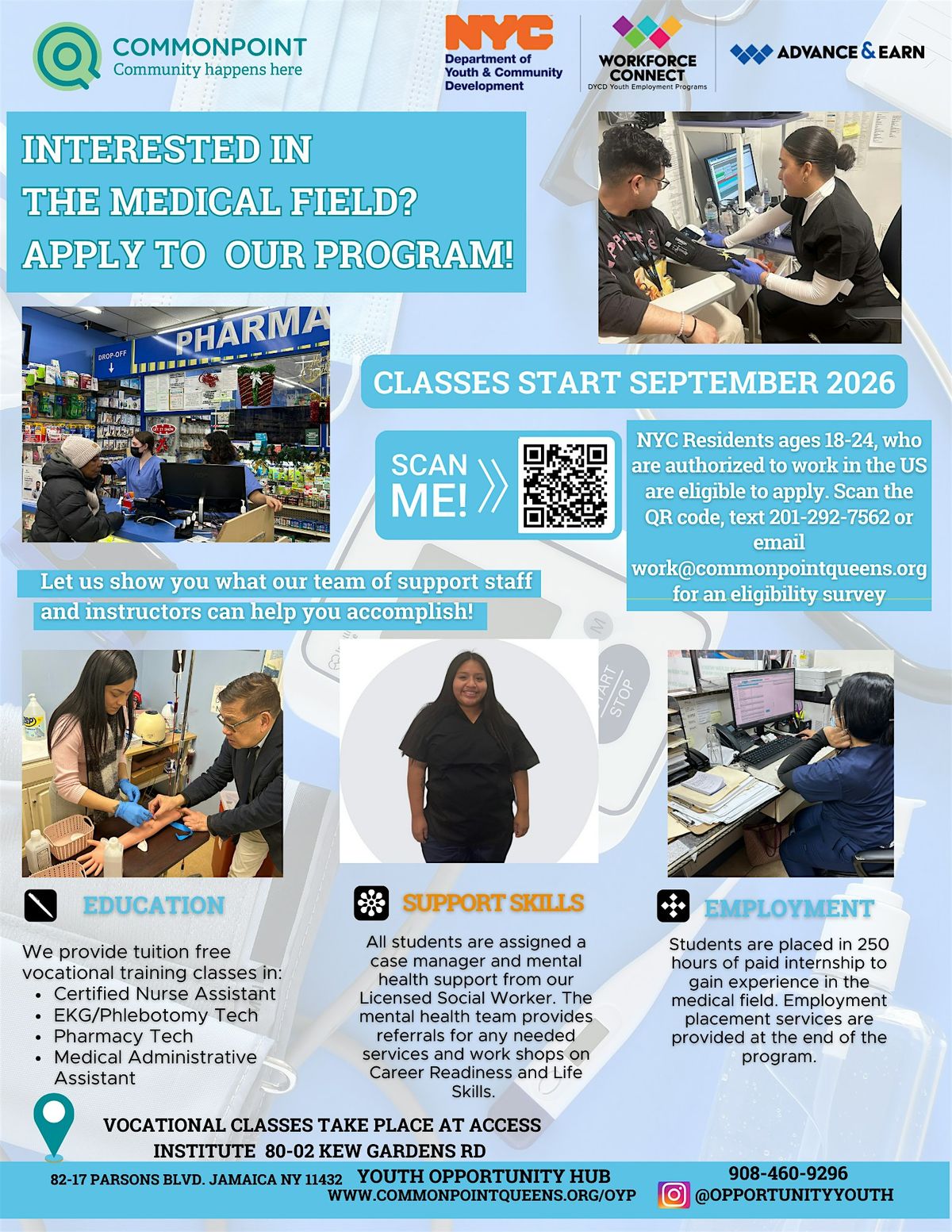 Free Medical certifications for ages 18–24 at Commonpoint in Queens NYC. Classes start September 2026.
