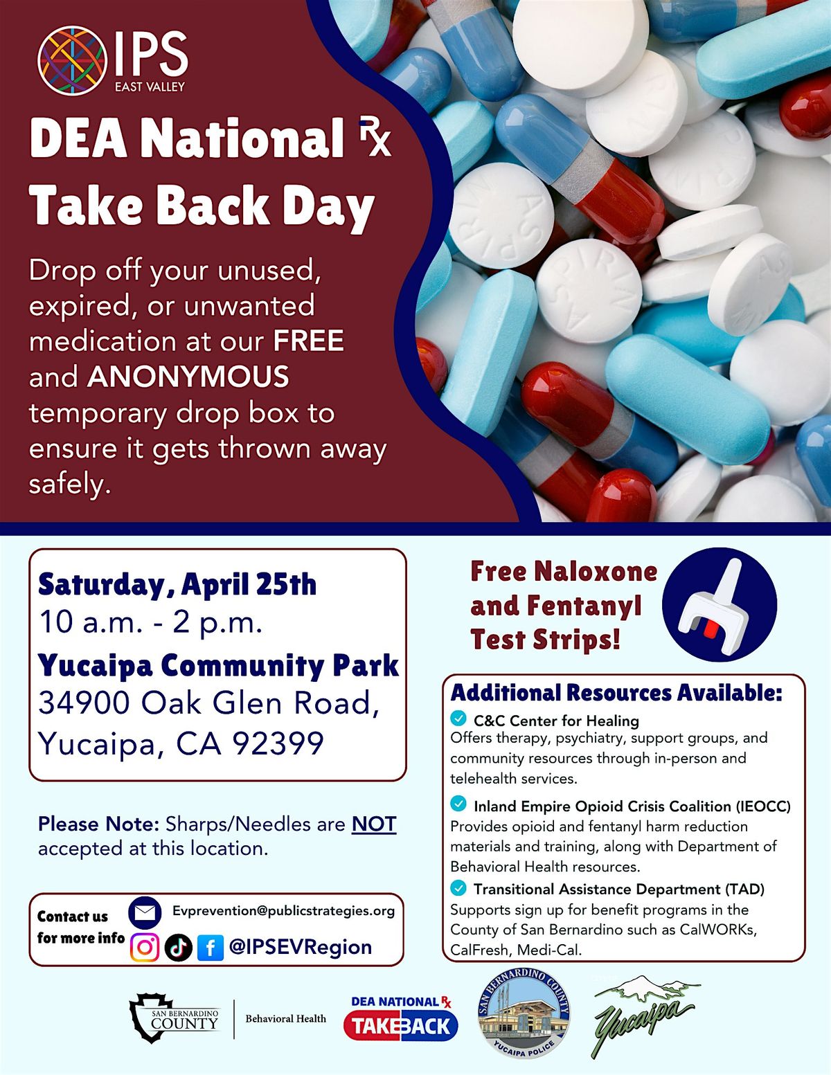 El Día Nacional de Devolución de Medicamentos de la DEA es una forma gratuita, segura, y anónima de eliminar medicamentos recetados no utilizados, vencidos o no deseados. Al desechar sus medicamentos correctamente esta ayudando prevenir el mal uso de las drogas y protegiendo nuestro medio ambiente. ¡Visítanos y haga su parte en convertir el valle de este en un lugar más seguro y saludable!