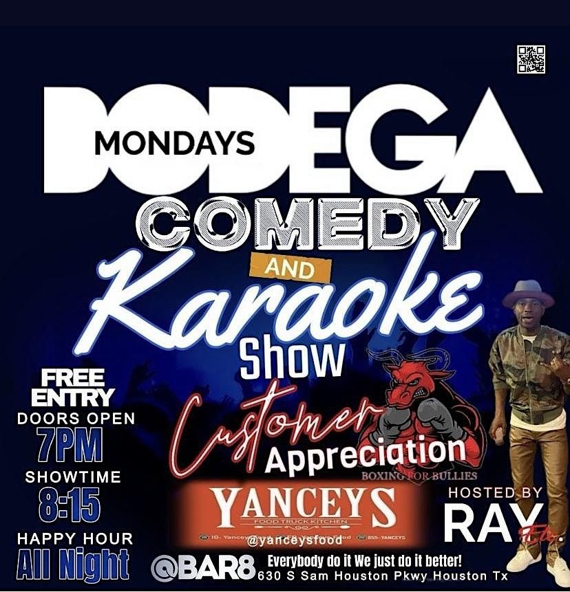 🎉 Join us for a laughter-filled Monday night at Bar 8, featuring a unique blend of comedy and karaoke, complemented by irresistible drink specials, savory hookah, and scrumptious food from Yancey's Food Truck! 🎤🍹