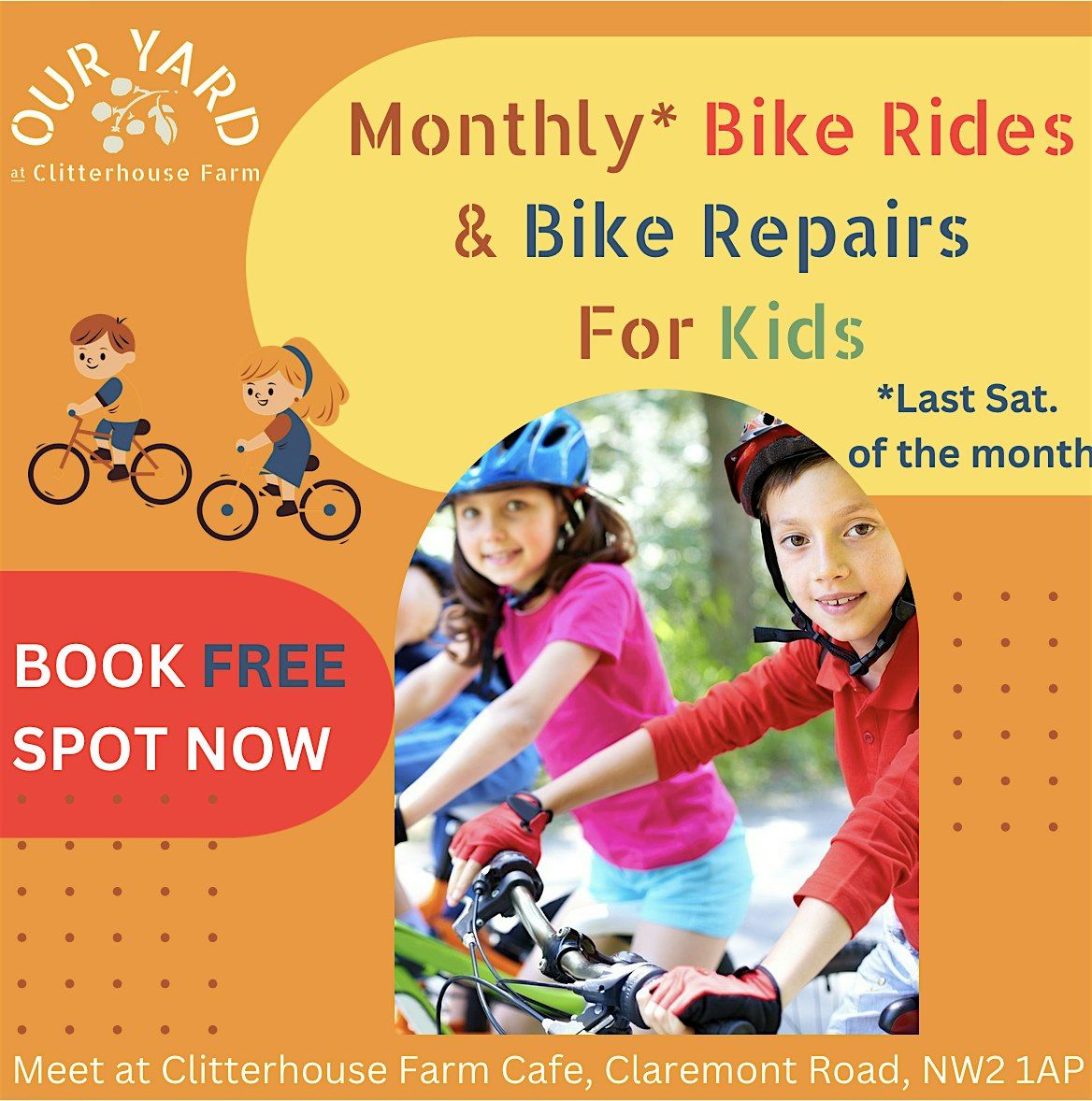 Hey kids (and parents!), do you love riding bikes or want to keep yours in tip-top shape? Join the coolest club in townβfor FREE! Charles, one of our amazing volunteers, leads fun, off-road kids' rides starting from the cafΓ© at Clitterhouse Farm. The routes are mostly through parks and fields, with occasional stretches on super-quiet roads.