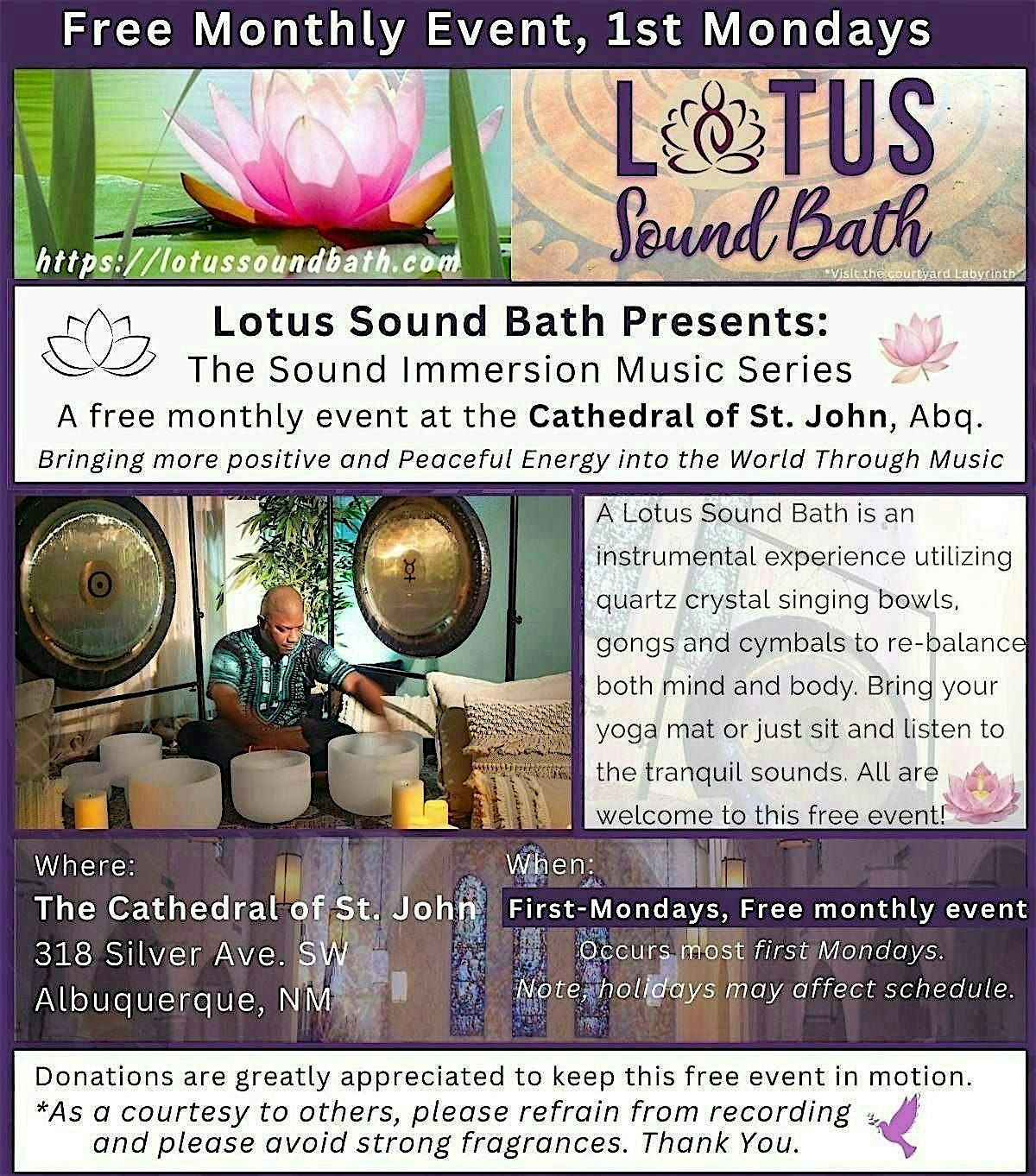 Unplug (to recharge!) and take a break from routine and daily stress every month with Douglas Cardwell and Lotus Sound Bath at the monthly (first-Mondays) sound healing series at the Cathedral of St John Albuquerque (318 Silver Ave. SW) First Monday of every month* Holidays change event to following (2nd) Monday.* If sold out on eventbrite, there is still room. Registration is optional but helps in planning. Thank You.