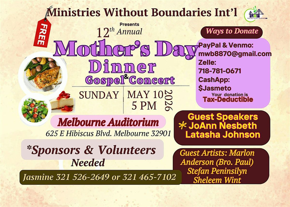 This is a FREE Mother's Day Dinner & Gospel Concert for the entire family. (Male, Female & Children.) On Mother's Day, many may not have money or family members to take them out. If possible, no mother should be home alone.