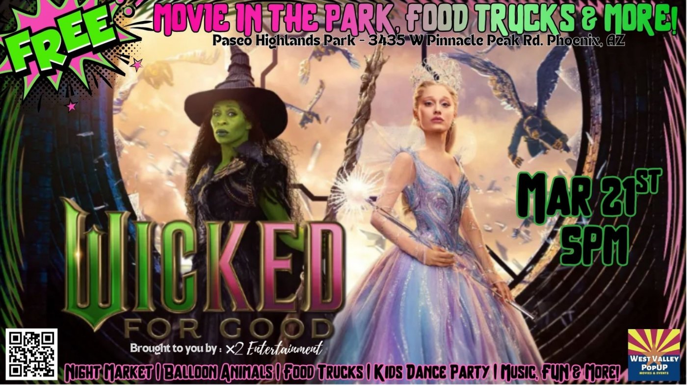 Fly in with your blankets & chairs to grab a spot on the grass cuz it's going to be a night that changes you for good. Bring your whole crew out for a FREE Movie in the Park only at Paseo Highlands Park: 3435 W Pinnacle Peak Rd, Phoenix, AZ featuring Universal Pictures brand new, box office smash hit: WICKED FOR GOOD!!
