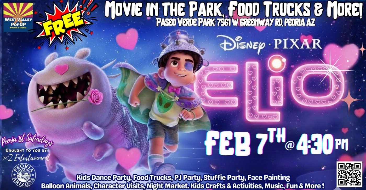 Blast off to FUN & FREE Movie in the Park!! Get ready for an out-of-this-world adventure featuring Disney’s latest cosmic journey... ELIO! FREE to Enter - FREE to Park - Pet friendly - Open to the public - Bring the whole family to Peoria 1st Saturdays FREE Monthly Movies in the Park!