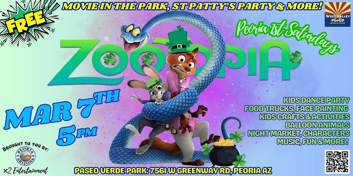 🆓FREE to Enter - 🆓FREE to Park - 🐶🐶Pet friendly - Open to the public-Bring the whole family for an all ages 🍀St. Pattys Day party @ Peoria 1st Saturdays FREE Monthly Movies in the Park featuring featuring Disney's BRAND NEW RELEASE - ZOOTOPIA 2!