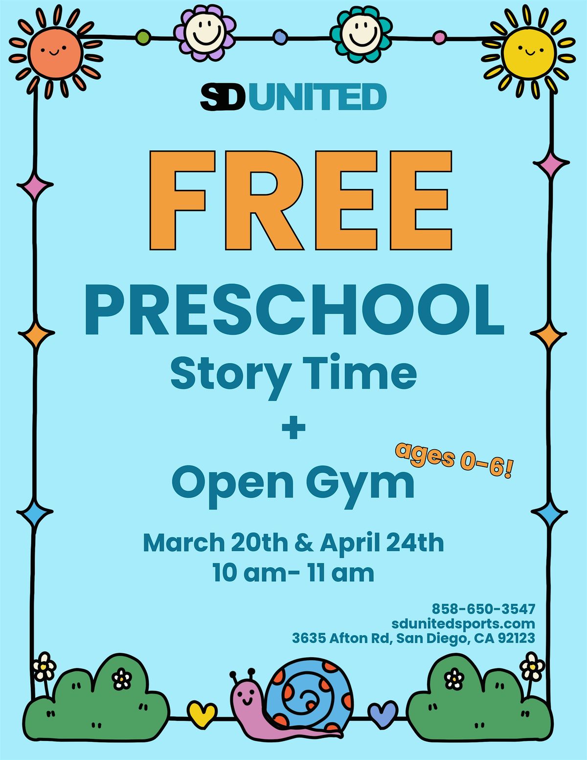 Join us at 3635 Afton Rd on April 24th, 2026 at 10:00 AM (Pacific Time) for a fun morning! Bring your little ones for a free story time followed by some playtime in the open gym. It’s a great chance to make new friends and enjoy some active fun in a relaxed setting. We can’t wait to see you there!