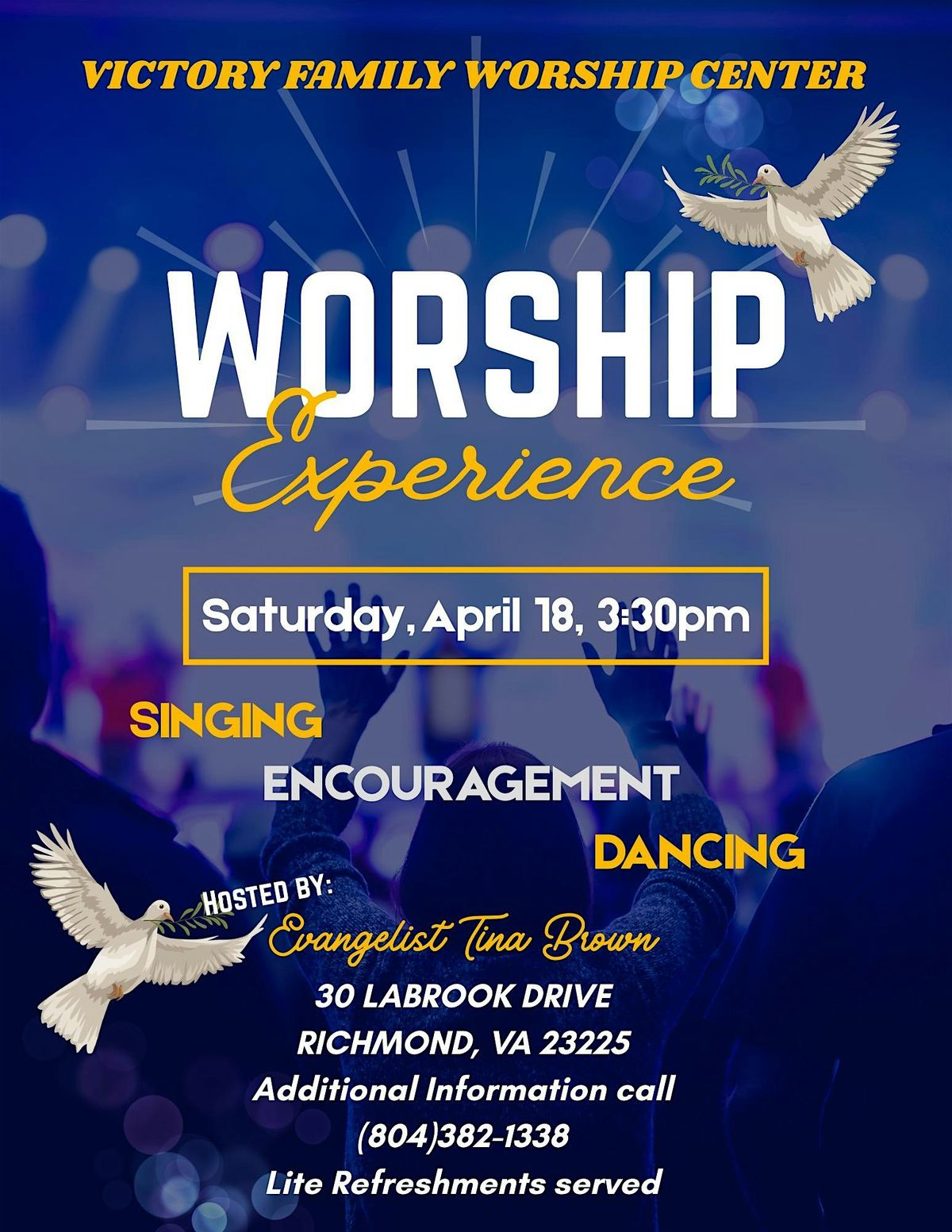 Come for a Time of Singing, Dancing and Encouragement as well as Fellowship with Like Minded People. Please contact Tina at 8043821338.