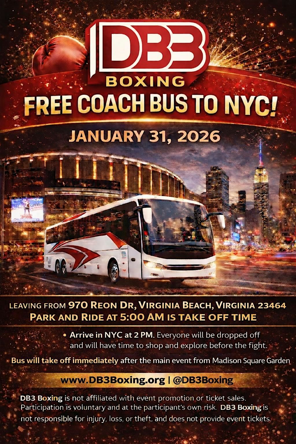 DB3 Boxing is offering a FREE round-trip coach bus ride from Norfolk, VA to New York City for youth and community members to attend a professional boxing event at Madison Square Garden on January 31, 2026.