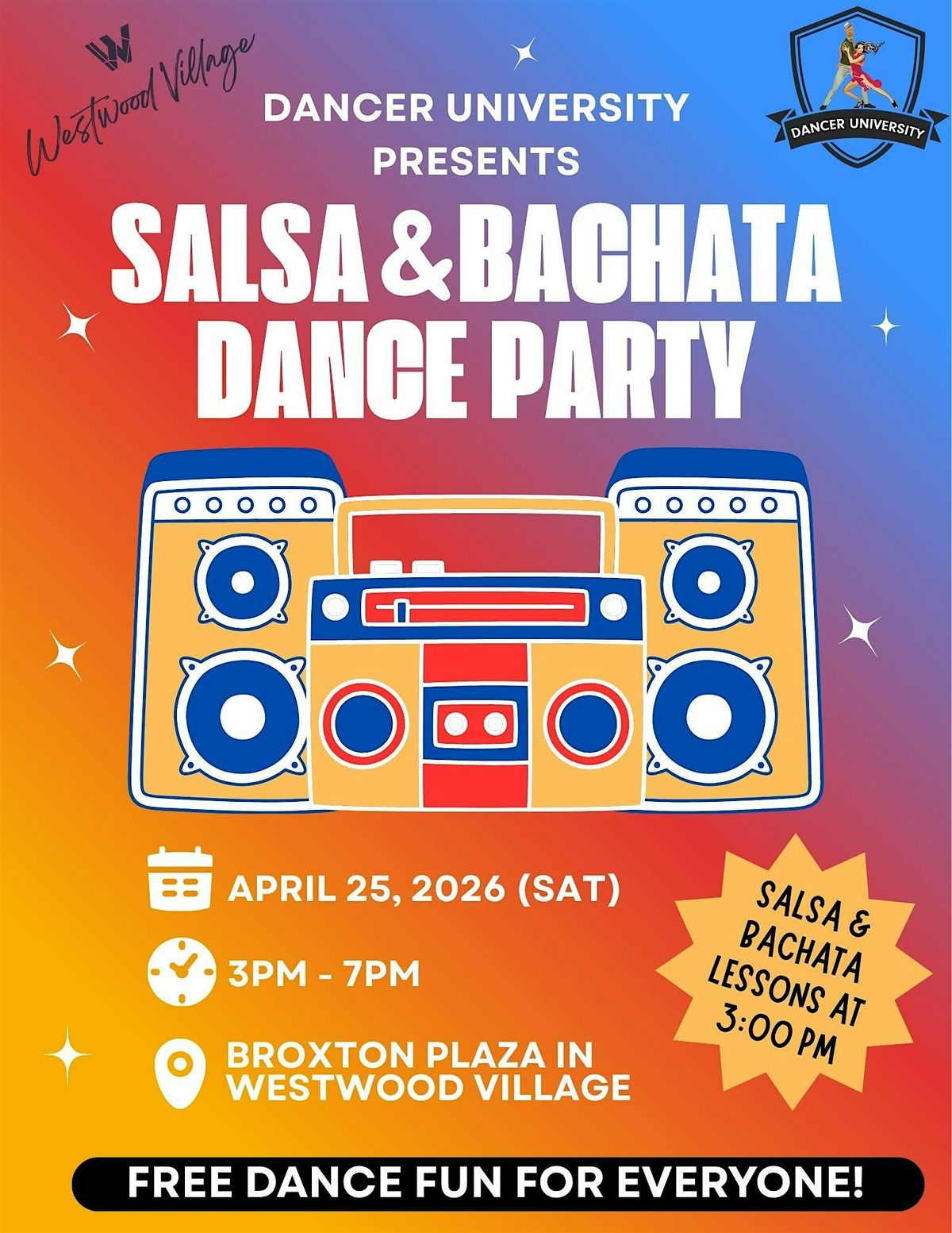 Join us for an afternoon of rhythm, community, and free dance fun in the heart of Westwood Village! Whether you’re a seasoned pro or have never taken a single step, this event is for YOU.