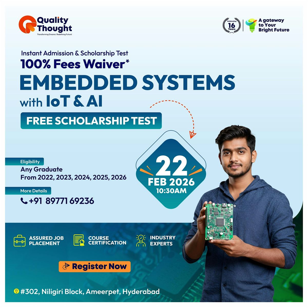 Info: In today’s technology-driven world, Embedded Systems combined with IoT and Artificial Intelligence are powering innovations across industries such as automotive, healthcare, smart cities, robotics, consumer electronics, and industrial automation. Companies are actively seeking skilled professionals who can design intelligent, connected, and efficient systems. This scholarship test is designed to identify passionate learners and help them take their first step toward a high-demand career.