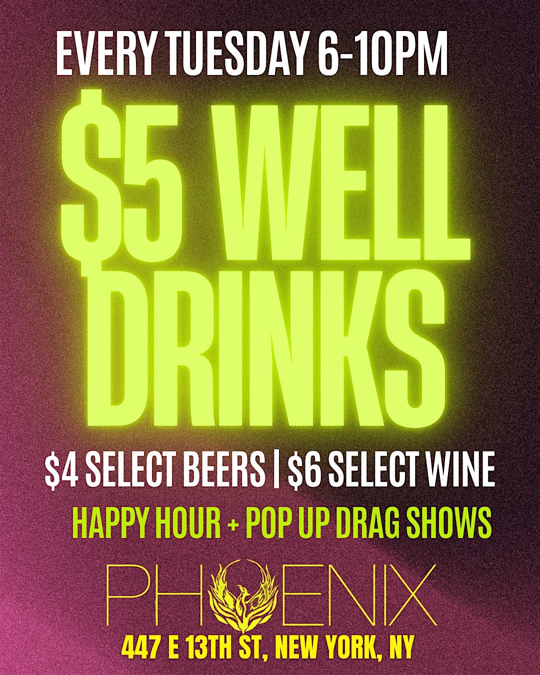 Tuesdays are the new Fridays! Come to the legendary Phoenix bar in the East Village, and enjoy $5 happy hour until midnight with RSVP. If you are one of the first 10 RSVPs your second drink is on the house. Just select the 'free second drink on us' ticket before they sell out!