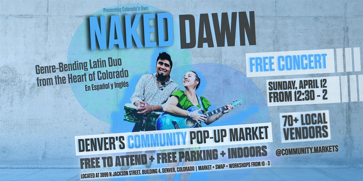 Colorado is built by people from many backgrounds. Denver’s Community Pop-up Market wanted our first live musical performance to celebrate this spirit. This Sunday, you are invited to a free concert by Naked Dawn inside the pop-up market. Naked Dawn is a Latin duo whose genre-bending sound spans traditional Mexican song forms, rock, blues, and folk, performed in both English and Spanish. Naked Dawn’s music is rooted in storytelling, drawing from the cultures, traditions, and lived experiences that are tied to Colorado. Come experience it live this Sunday, 12:30 PM – 2:00 PM. Free live music, 70+ local vendors, clothing swap, mutual aid distro, skill-sharing workshops from 10 - 3 pm