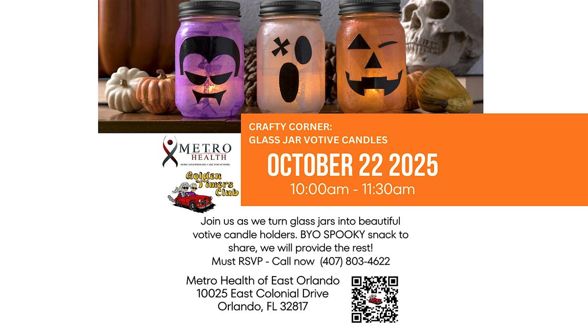 Get creative with us at MetroHealth of East Orlando! We’ll be turning simple glass jars into beautiful votive candle holders—just in time for spooky season. 👻✨