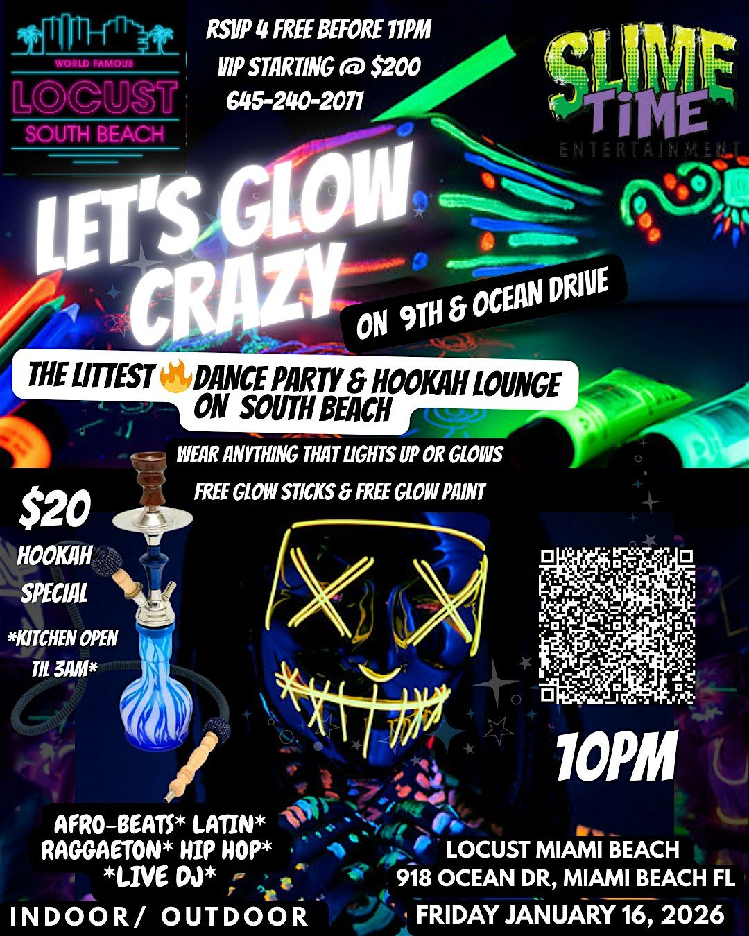 Welcome to the Litest Friday Night Party on South Beach! We have hip hop & R&B, Raggaeton, Afro-Beats, Soca & Live Performances all on the Famous Ocean Drive, Miami Beach. WEAR ALL YOUR LIGHT UPS AND GLOW UPS, WE ALSO HAVE FREE GLOW STICKS AND FREE GLOW PAINT. The weather is perfect, the Frozen Beverages are the Best on South Beach, and great music, makes the perfect recipe for a DANCE PARTY!!!!!