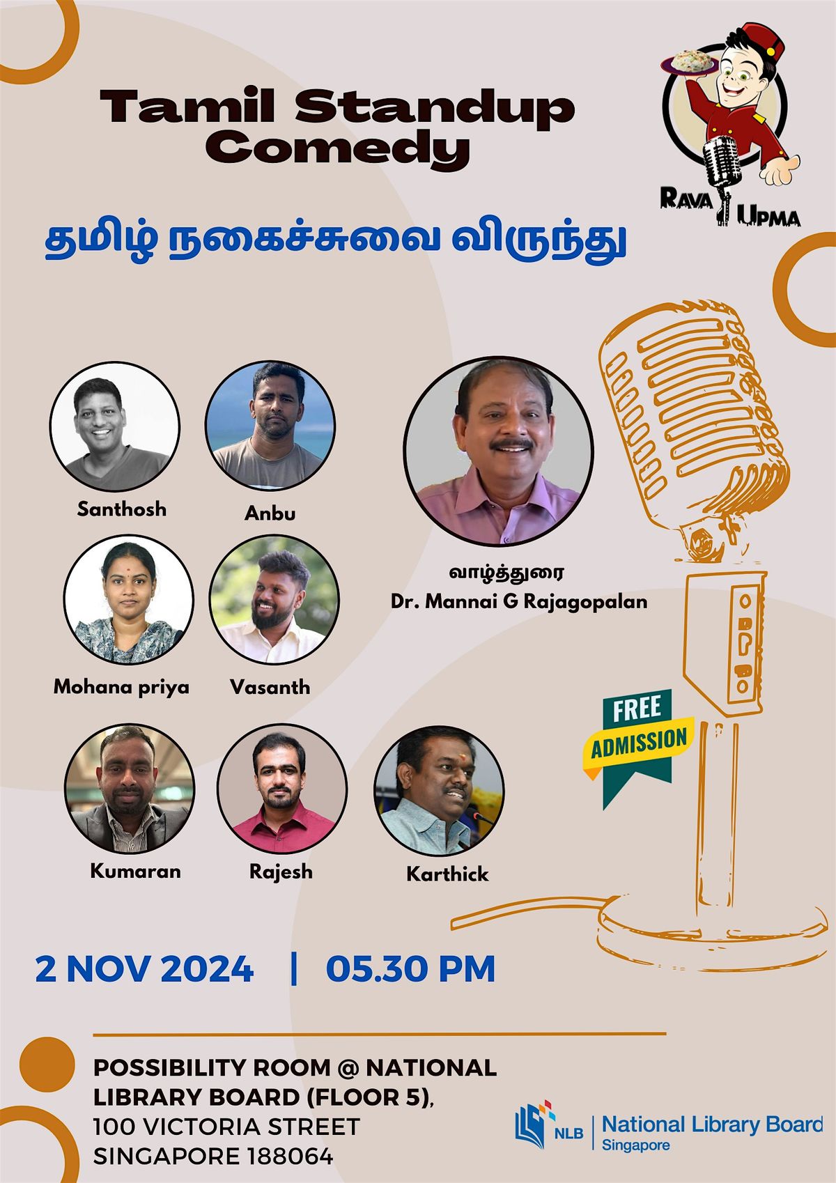 நகைச்சுவை என்பது அனைவராலும் ரசிக்கப்படும் ஒன்று. அதிலும் வயிறு குலுங்க வைக்கும் நல்லதொரு நகைச்சுவையைக் கேட்டு ரசிக்க உங்களுக்கு ஆர்வம் உண்டா? ஆமெனில், 2 Nov 2024 -ஆம் தேதி ரவா உப்புமா குழுவினர் படைக்கும் நகைச்சுவை விருந்துக்கு உங்களை அன்புடன் அழைக்கிறோம். சுமார் 1.5 மணி நேரம் நிகழவிருக்கும் இந்நிகழ்ச்சியில் பார்வையாளர்கள் வயிறு குலுங்க சிரிப்பதோடு மட்டுமல்லாமல், நல்ல தமிழைக் கேட்ட ஆனந்தத்தில் புன்னகை மாறாமல் செல்வார்கள் என்பது திண்ணம். சொந்த வாழ்க்கை அனுபவங்கள், சமூக நிகழ்வுகள் இவை அனைத்தையும் நகைச்சுவையாக சொல்லவல்ல நல்ல பேச்சாளர்களை உங்கள் முன் நிறுத்தும் நிகழ்ச்சி இது.