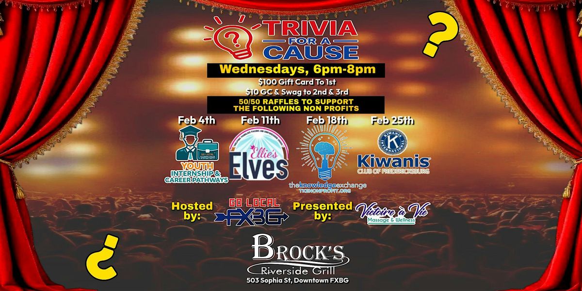 Join us for Trivia for a Cause at Brock’s Riverside Grill – a fun night out where every answer makes an impact! Grab your friends, test your knowledge, and enjoy a community night that gives back to local nonprofits.