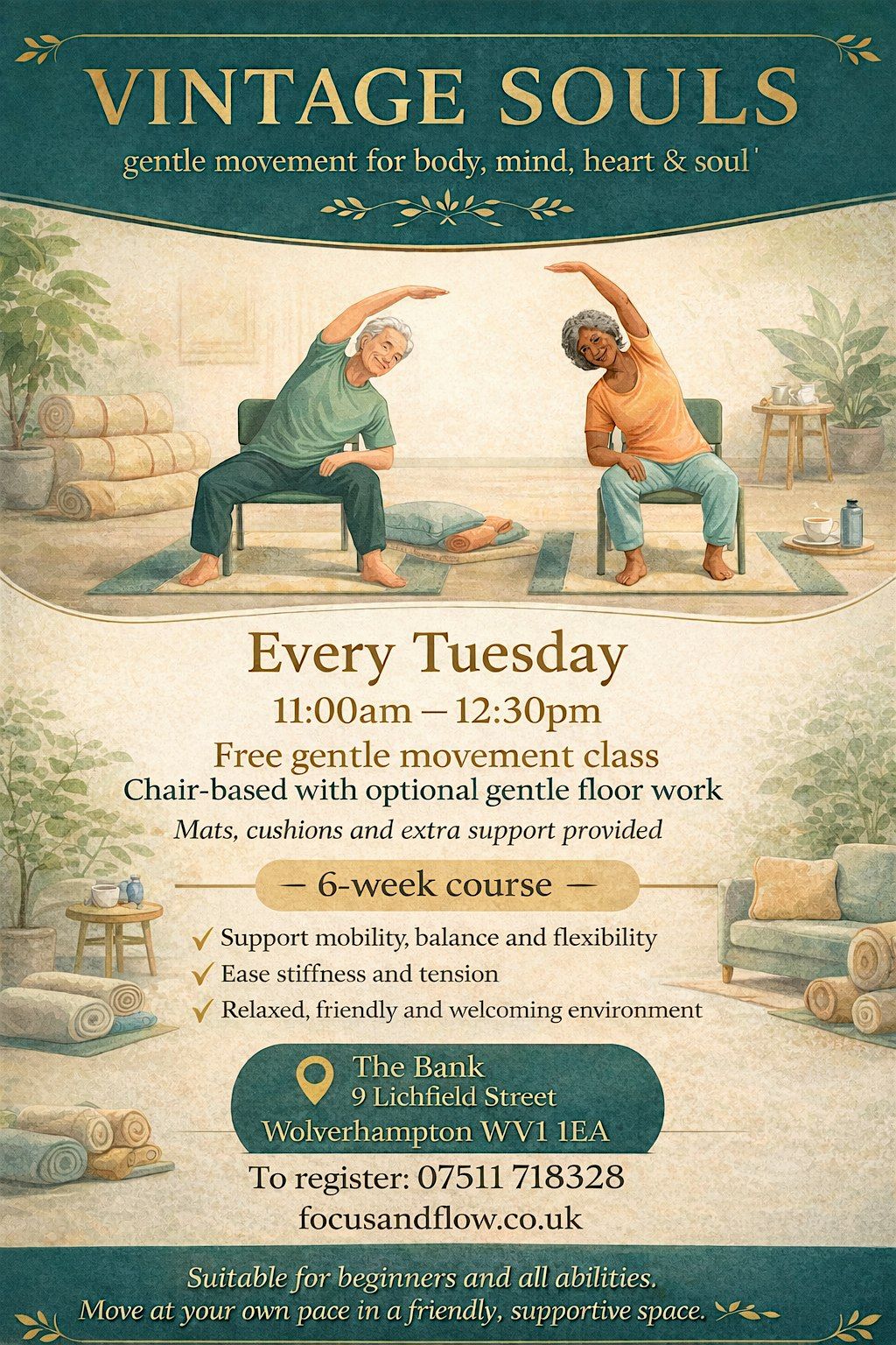 ✨ NEW: Vintage Souls – Gentle Chair & Floor Yoga (6-week course) ✨Looking for a calm, friendly way to keep moving, stretch gently and feel supported?Vintage Souls is a gentle movement class created with older adults in mind. Sessions include chair-based movement with optional gentle floor work, using mats, cushions and extra support — everything is adaptable, and you move at your own pace.🧘♀️ Improve flexibility, balance & confidence💛 Ease stiffness and tension🤝 Connect with others in a welcoming space☕ Enjoy light refreshments after the session📅 Every Tuesday🕚 11:00am – 12:30pm📆 6-week course📍 The Bank, 9 Lichfield Street, Wolverhampton, WV1 1EA📞 To register: 07511 718328
