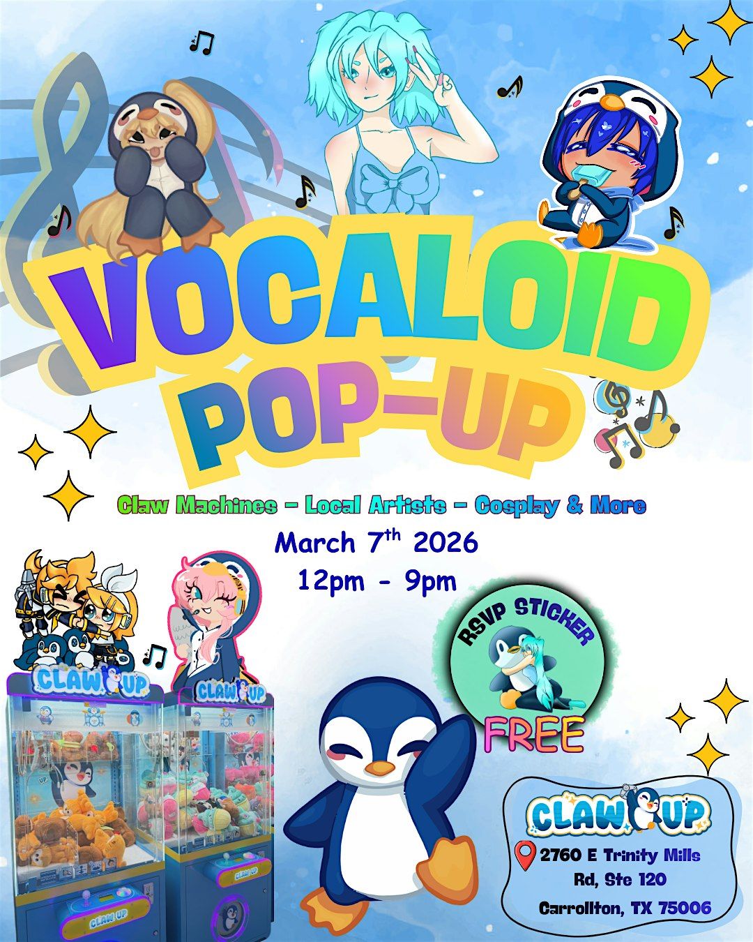 Claw machines, Project Diva games, stamp rally for prizes, 4PM random dance, Kitsune’s Kitchen treats & cosplay!About this Event