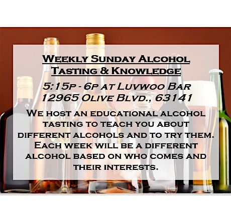 Every week on Sunday from 5:15P - 6:00P at Luvwoo Bar, we host an educational alcohol tasting to teach you about different alcohols and to try them. Each week will be a different alcohol based on who comes and their interests. We recommend eating something before hand. This is free, but we ask that you purchase something to support the venue! You must be age 21+.