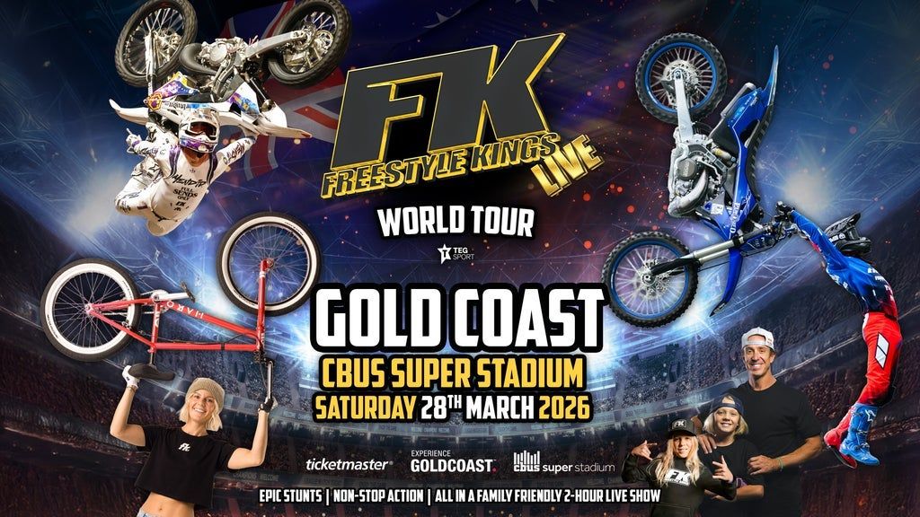Approximate Running Times: VIP Gates - 4:00pm VIP Function - 4:00pm-4:45pm General Gates - 5:00pm Show Start - 6:00pm Finish - 8:00pm The ultimate adrenaline-fueled family event - Freestyle Kings LIVE! Get ready to witness the world's best action sports athletes, led by the legendary Robbie Maddison, his sons Kruz & Jagger, FMX world champion's Clinton Moore, Pat Bowden, and current X Games gold medalist Robbie Adelberg. Alongside the powerhouse Freestyle Kings FMX team, they'll push action sports to breathtaking new heights. From jaw-dropping double backflips, front flips, and never-before-seen tricks to gravity-defying BMX stunts, led by New Zealand Superstar doing it for the ladies Ellie Chew and Triple Backflip madmen Harley Allen. This 2 hour live action sports spectacular will have the whole family on the edge of their seats. .