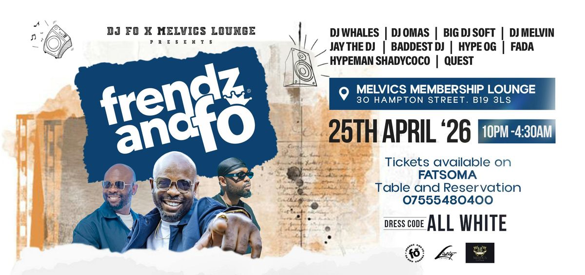 FRENDZ AND FO (All White Edition)Come experience the ultimate fusion of Luxury, music, culture, Hosted at the upscale Melvic’s Membership Lounge by Birmingham’s finest Dj FO.