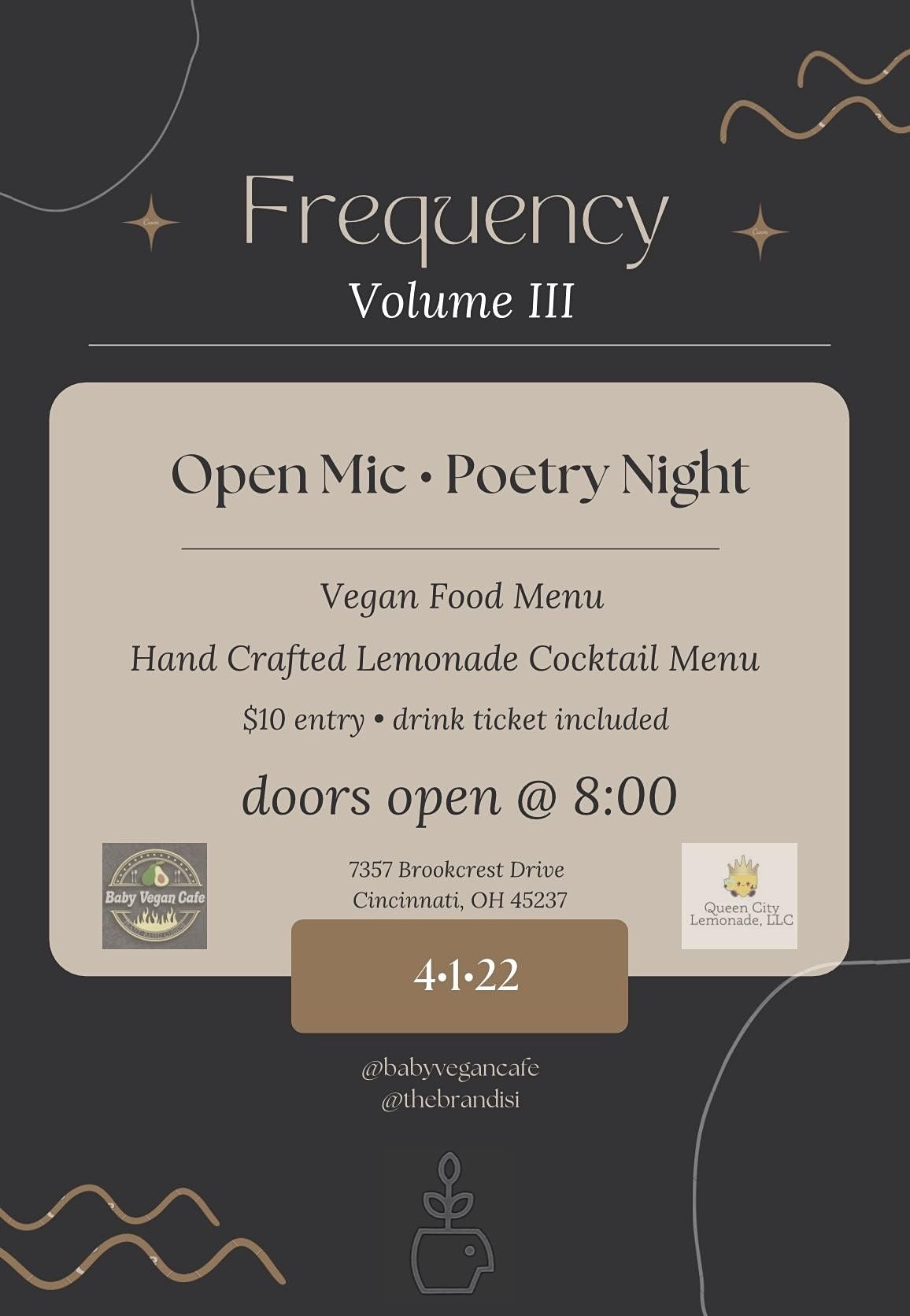 Back by popular demand - Frequency Open Mic Volume III hosted @ Baby Vegan Cafe! Vegan food menu, crafted lemonade cocktails, poetry & more!About this Event