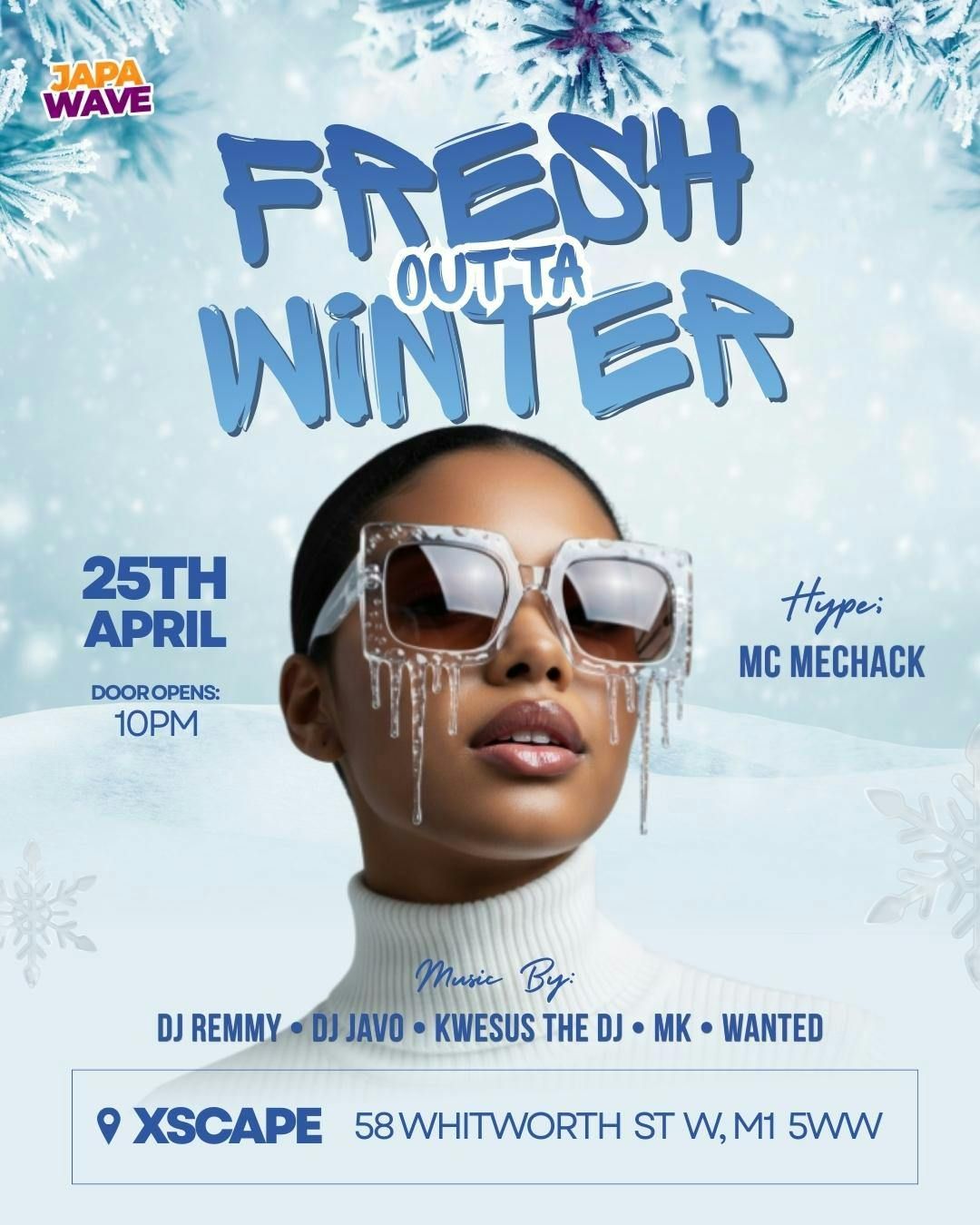Shake off the winter blues and step into the ultimate party vibe at FRESH OUTTA WINTER, happening at Xscape Manchester on Saturday 25th April 2026, from 10PM โ 4AM.Get ready for a night packed with the hottest sounds in Afrobeats, Hip-Hop, Amapiano, RnB, and Dancehall, with stylish crowds, nonstop music, and an electric atmosphere guaranteed to kick off the new season in style. Whether youโre dancing, celebrating with friends, or just soaking up the energy, this is the party you donโt want to miss.