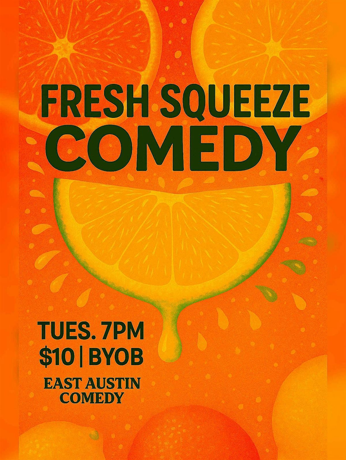 Fresh Squeeze Comedy is a stand-up show where top comics throw down new heat alongside their best material. It’s a mix of fresh ideas, sharp sets, and genuine moments—all in a fun, fast-paced night of live comedy. No fluff, no pressure—just good vibes and great jokes. Squeezed fresh. Served live.