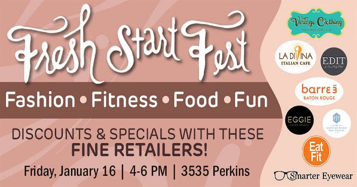 Join us at Acadian Village Shopping Center for FRESH START FEST on Friday, January 16, beginning at 4:00 PM, for an evening of Fashion, Fitness, Food & Fun!
