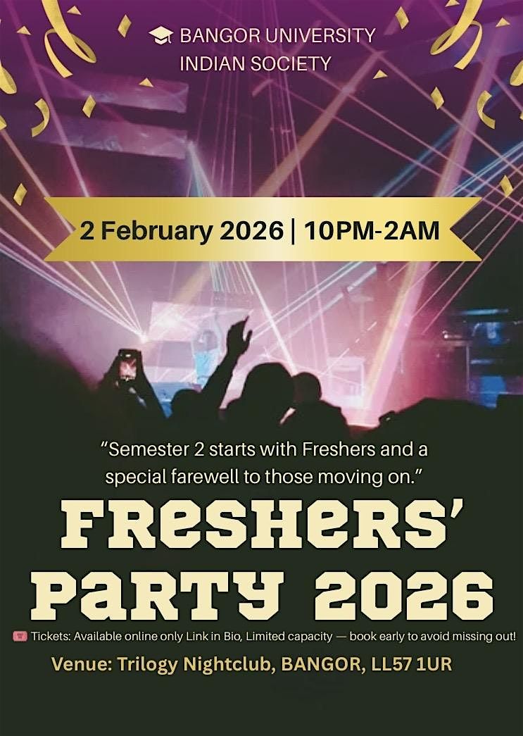 Kick off Semester 2 in style as we welcome our Freshers and celebrate with returning students at an unforgettable club night organised by Bangor University Indian Society.